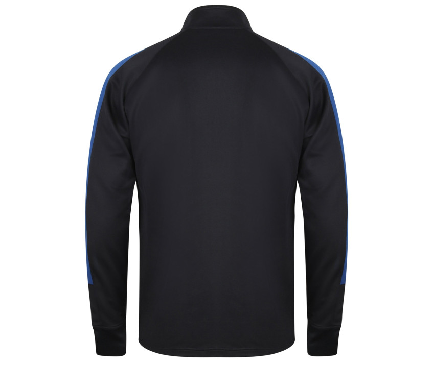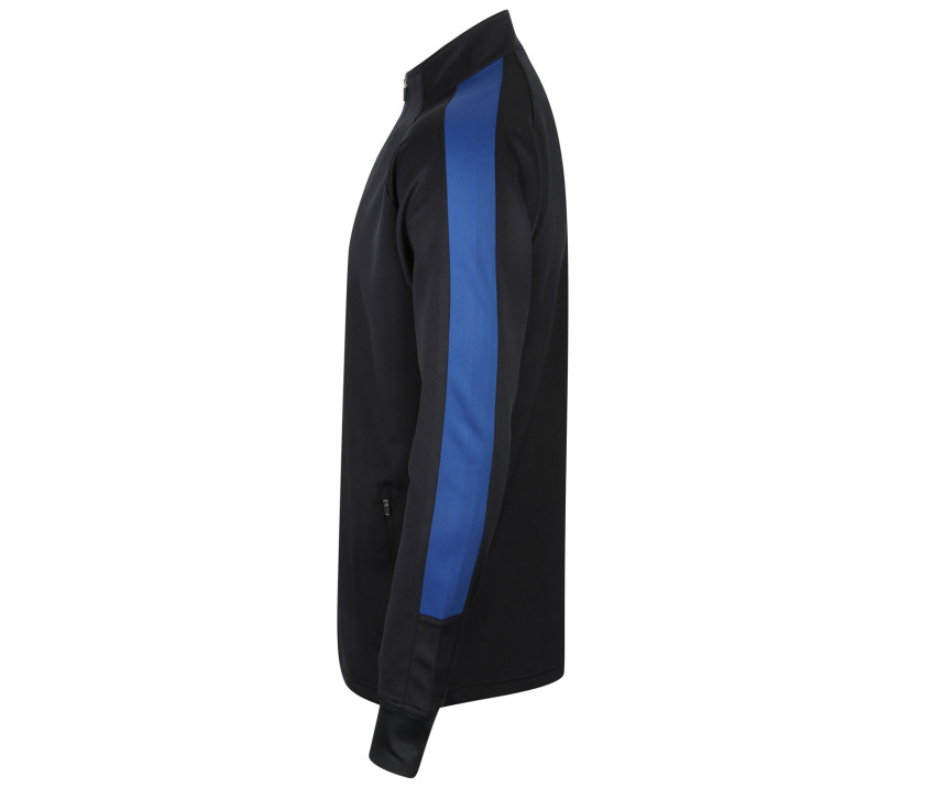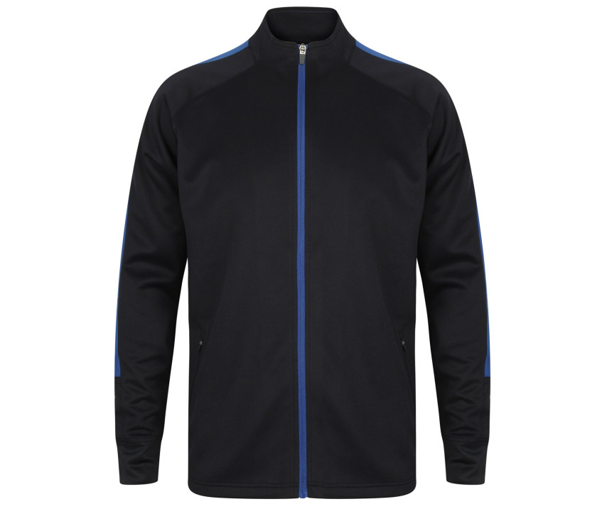 Jacke mit durchgehendem Reißverschluss kontrastiert. Kontraststreifen Schultern und Ärmel. Seitentaschen mit Reißverschluss. Ärmel mit 1x1-Rippenbündchen. Stehkragen.