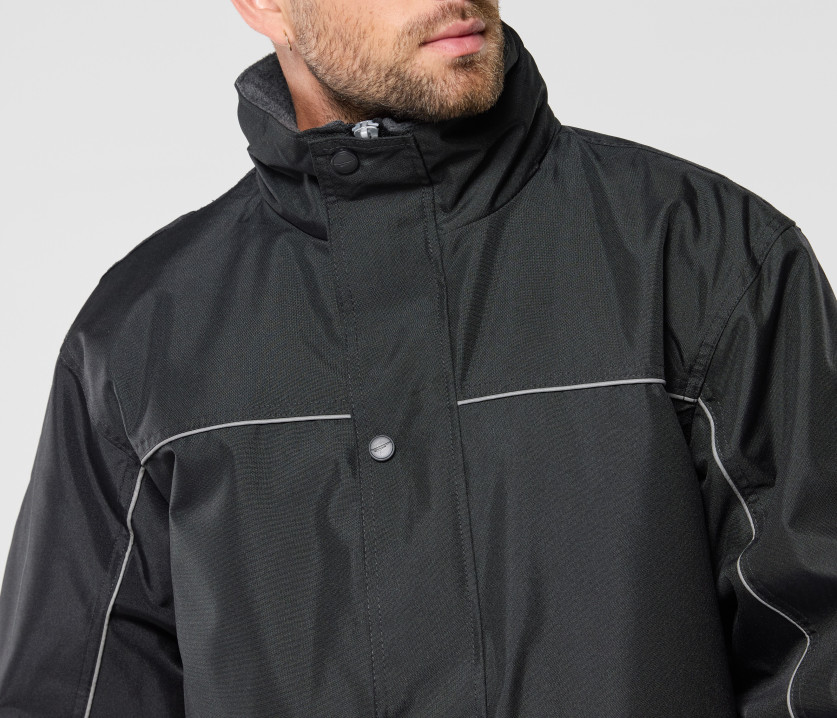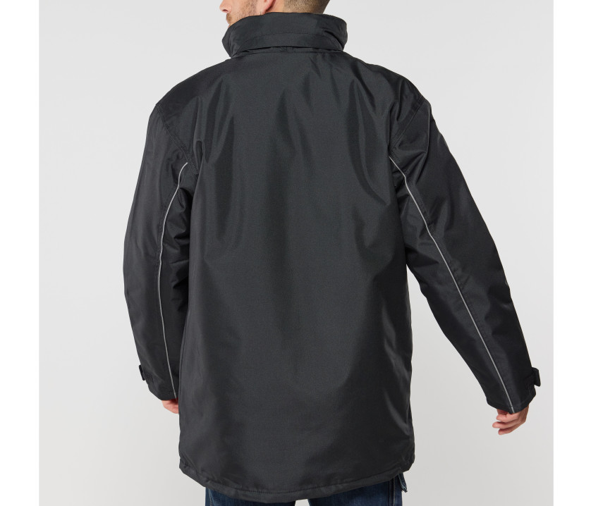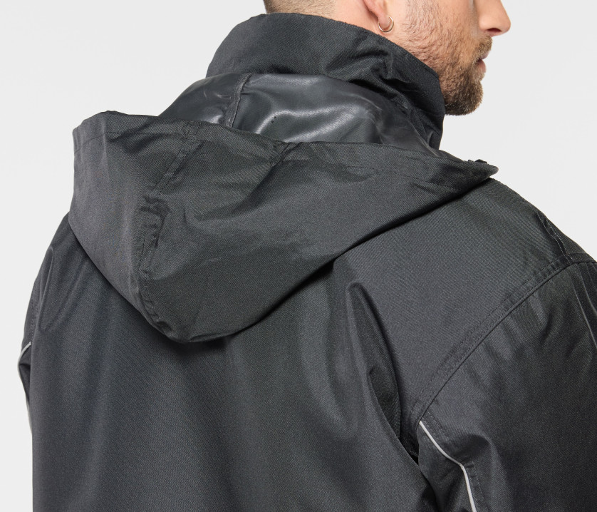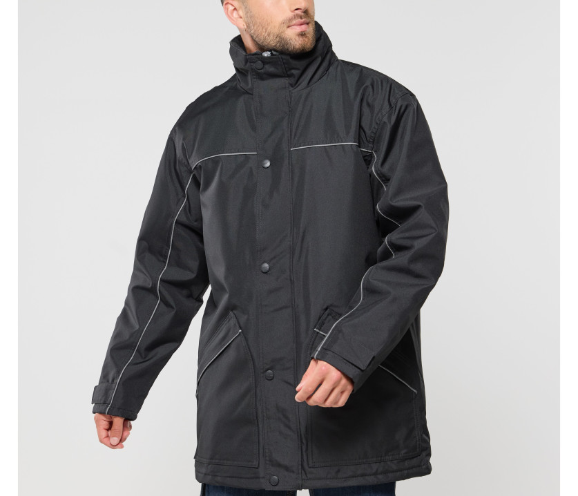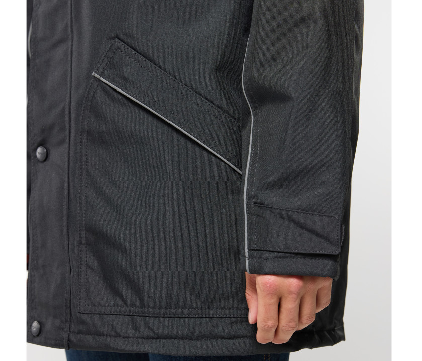 Winddicht mit wasserdichter Beschichtung. 2 Außentaschen mit Reißverschluss. 2 Innentaschen. Kapuze aus Oxford im Kragen. Kragen mit Fleece-Futter. Klettverschlussband an den Ärmeln. Zugriff für die Personalisierung. Reflexpaspel an den Ärmeln, vorne und Taschen.