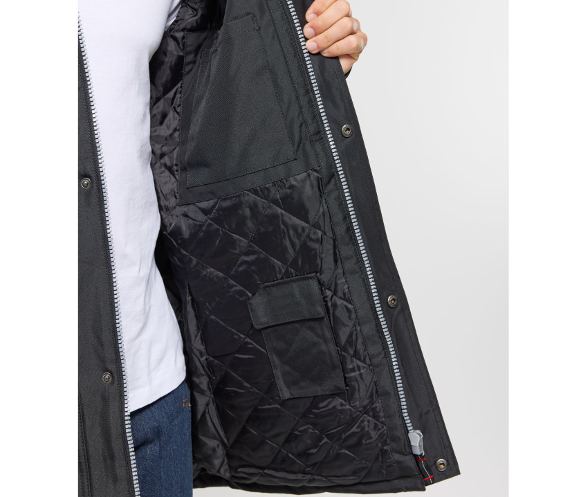 - Winddicht mit wasserdichter Beschichtung. 2 Außentaschen mit Reißverschluss. Kapuze aus Oxford im Kragen.