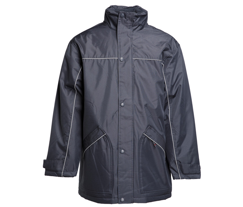 Winddicht mit wasserdichter Beschichtung. 2 Außentaschen mit Reißverschluss. 2 Innentaschen. Kapuze aus Oxford im Kragen. Kragen mit Fleece-Futter. Klettverschlussband an den Ärmeln. Zugriff für die Personalisierung. Reflexpaspel an den Ärmeln, vorne und Taschen.