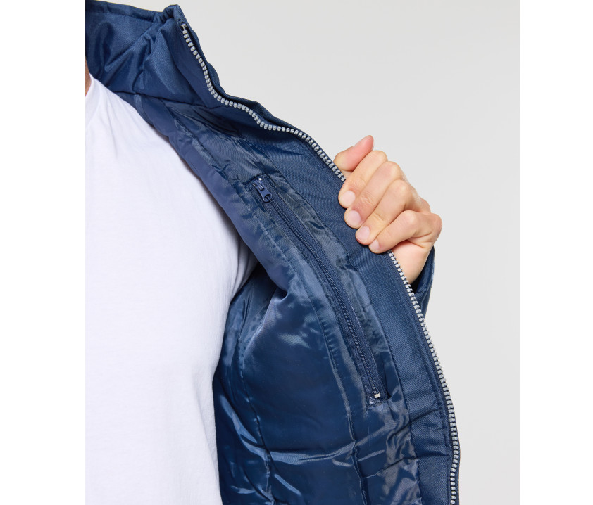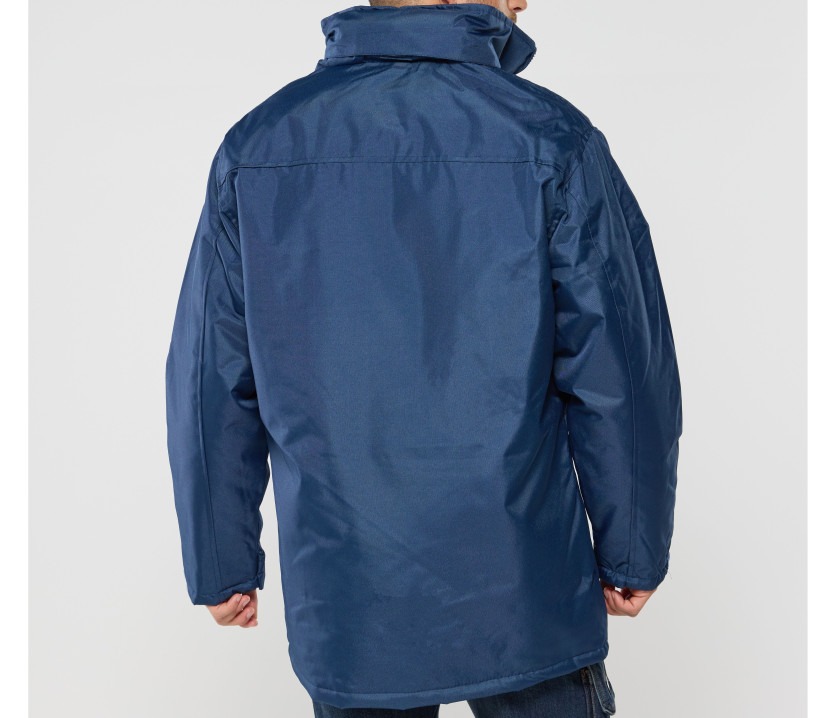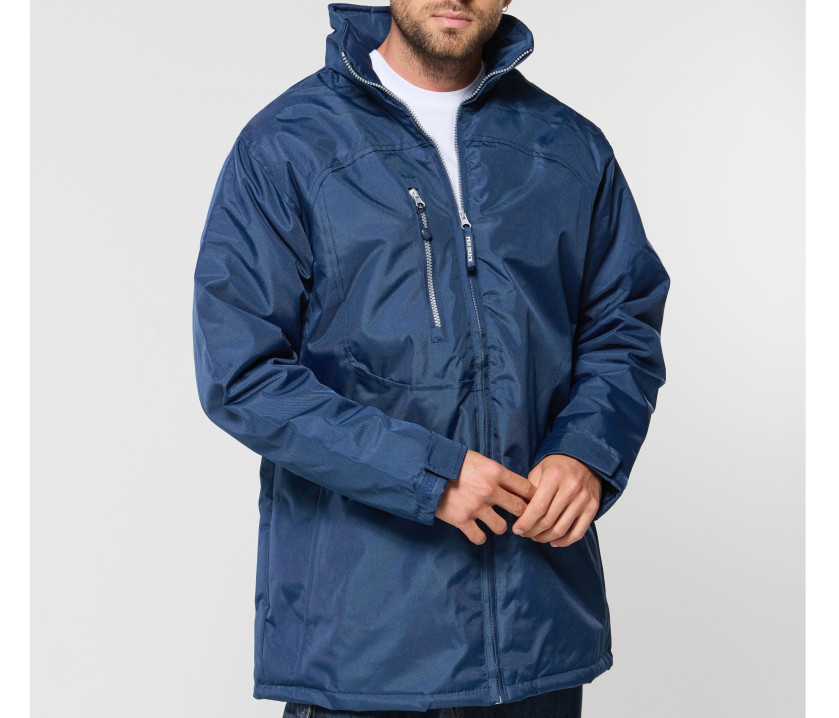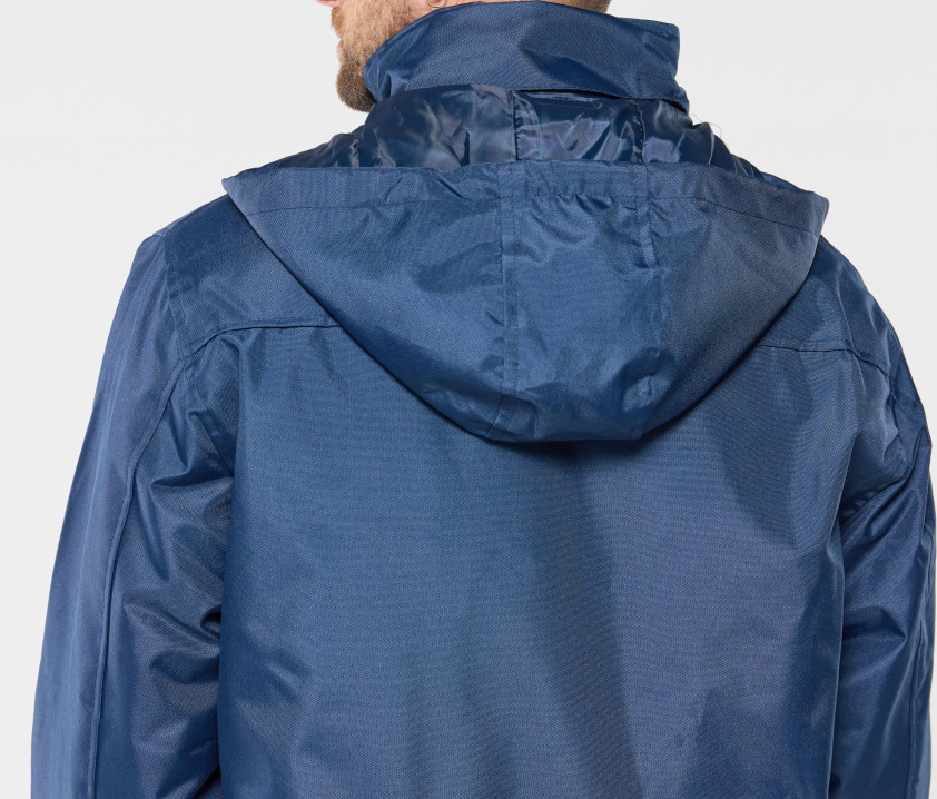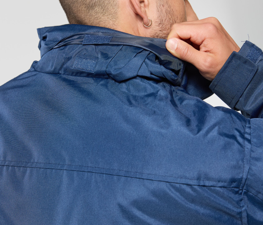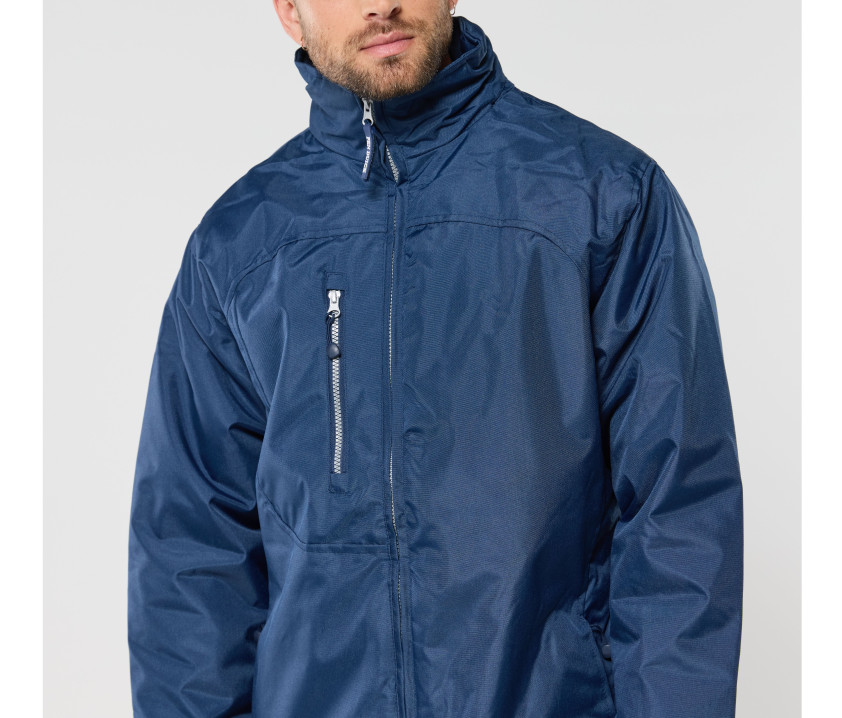 Winddicht und wasserdicht 1000mm. Kapuze im Kragen, verstellbar mit Stopper. Verstellbare Ärmelabschlüsse. Anliegende Passform. Innentasche mit Reißverschluss. 2 Seitentaschen mit Reißverschluss. Brusttasche mit Reißverschluss. Lasche Pen Duick abnehmbar am Hauptreißverschluss. Zugriff für die Personalisierung.
