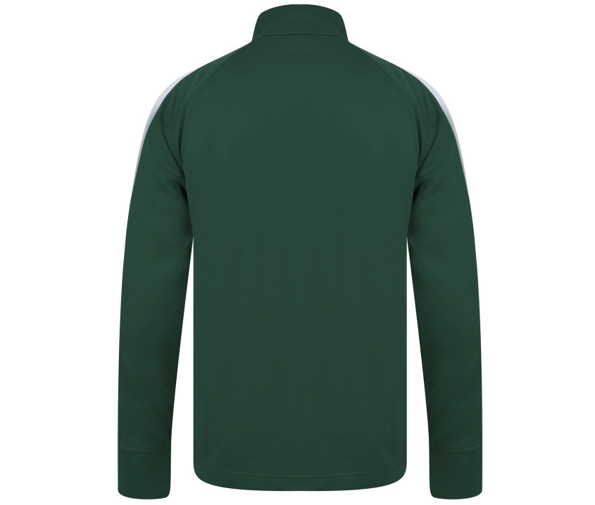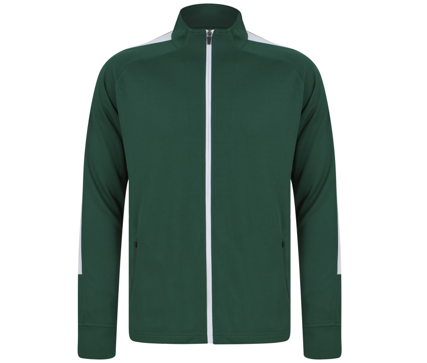 Jacke mit durchgehendem Reißverschluss kontrastiert. Kontraststreifen Schultern und Ärmel. Seitentaschen mit Reißverschluss. Ärmel mit 1x1-Rippenbündchen. Stehkragen.