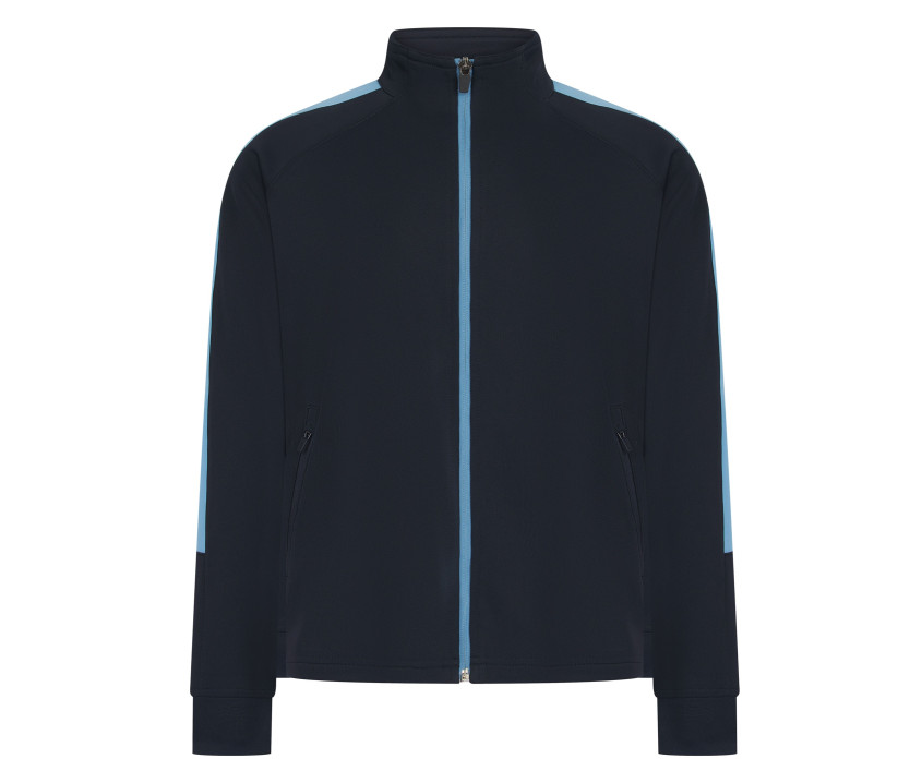 Jacke mit durchgehendem Reißverschluss kontrastiert. Kontraststreifen Schultern und Ärmel. Seitentaschen mit Reißverschluss. Ärmel mit 1x1-Rippenbündchen. Stehkragen.