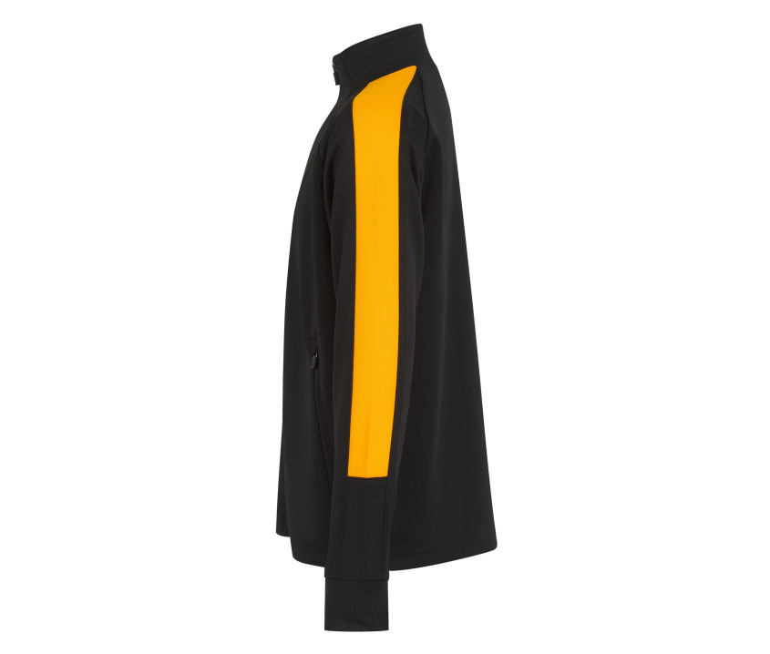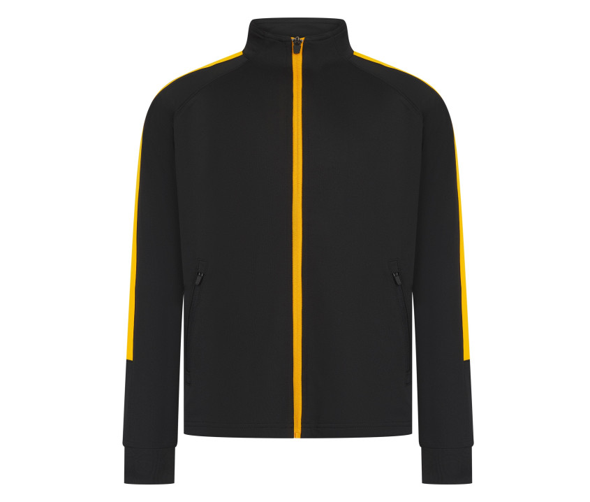 Jacke mit durchgehendem Reißverschluss kontrastiert. Kontraststreifen Schultern und Ärmel. Seitentaschen mit Reißverschluss. Ärmel mit 1x1-Rippenbündchen. Stehkragen.