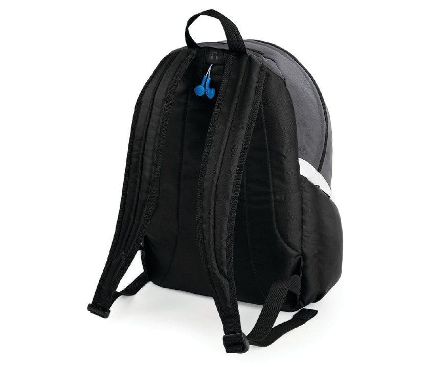 Multimediatasche mit Fellfütterung. Ring zum Durchführen der Ohrhörerkabel. Tasche für nasse Sachen/Ball. Flaschenhalter. Elastische Seitentasche aus Maschengewebe. Seitliche Reißverschlusstasche. Gepolsterter Rücken. Gepolsterte, verstellbare Schulterriemen. Tragegriff. Der verwendete recycelte Polyester entspricht 12,5 Flaschen à 550 ml.