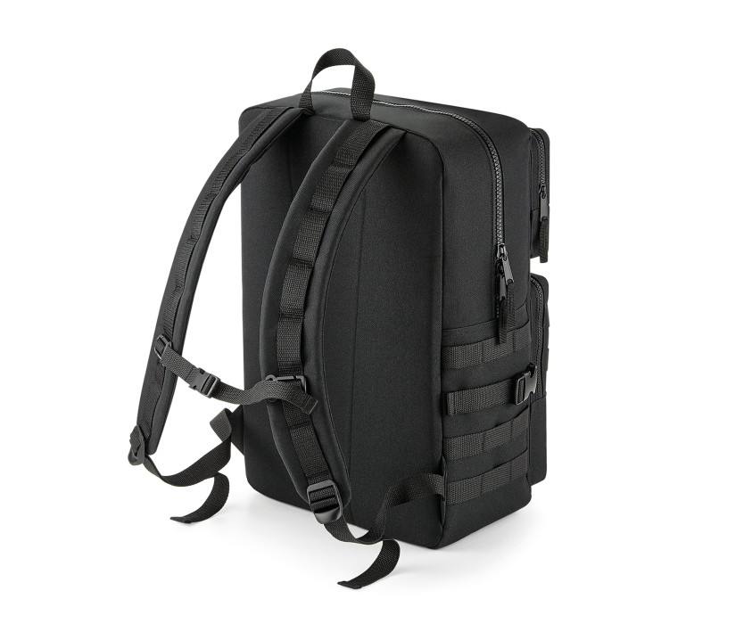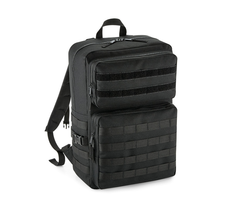 Ablösbares Etikett. Militärstil. MOLLE Riemen aus Rip-Strip™. Schlaufen für MOLLE Riemen. 2 große Taschen mit Reißverschluss vorne. Hauptfach mit Reißverschluss. Innentasche. Tragegriff. Rücken verstärkt. Kompressionsriemen. Gepolsterte, verstellbare Träger. Kombinierbar mit dem Einsatz MOLLE BG840 und den Taschen Modulr™ BG241 und BG242. Bedruckbare Fläche: 9x6 cm.