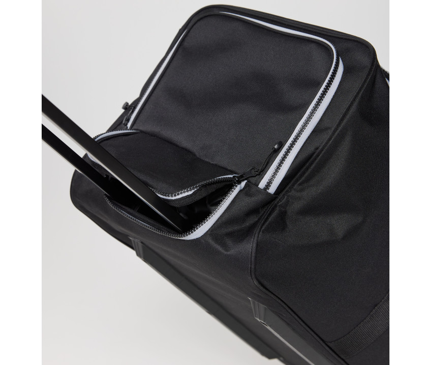 Große Reisetasche mit Rädern. Ausziehgriff. 2 Trägerriemen. Seitenfach und Hauptfach u-förmig. Kontrastierte Reißverschlüsse. Bedruckbare Flächen vorne: 16x12 cm und Seiten: 16x18 cm.