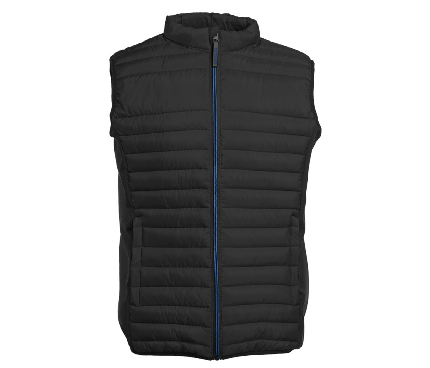 Leichter, modischer Bodywarmer aus Bi-Material. 2 Seitentaschen mit Reißverschluss. Kinnschutz. Kontrastierte Reißverschlüsse. Druckfläche vorne 9 cm und hinten 12 cm.