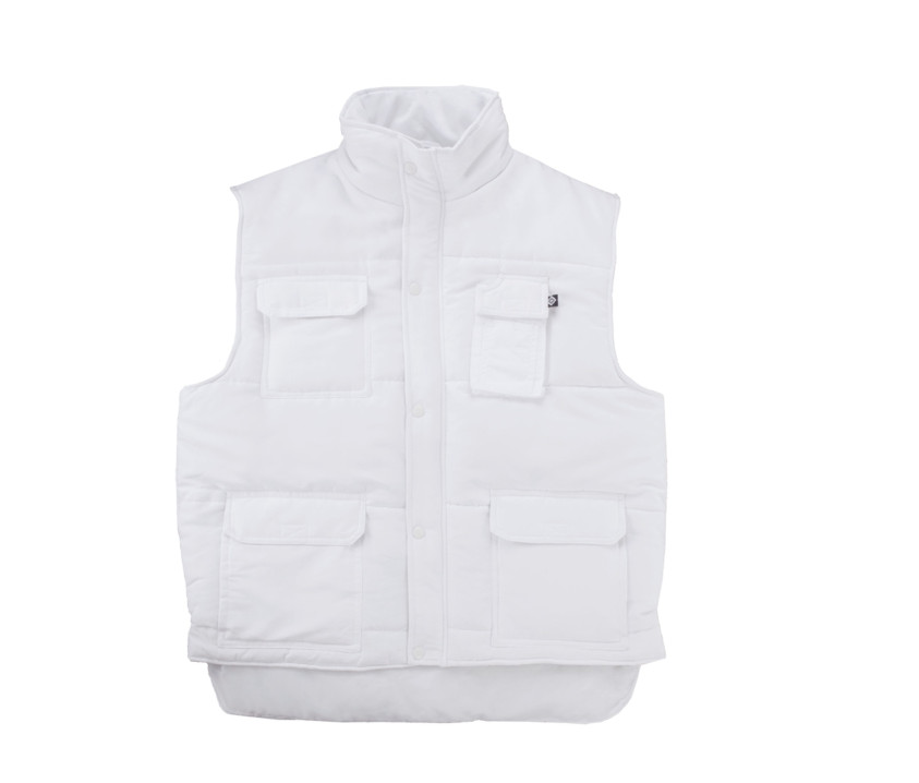 Gesteppter Bodywarmer. Klappe in der Mitte mit Druckknöpfen. Elastischer Bund. Einsatz Windjacke an den Armausschnitten. 7 Taschen: 2 Brusttaschen mit Klappe und Klettverschluss, 1 davon mit Stiftfach, 2 Vordertaschen mit Klappe und Klettverschluss und unter jeder 2 Seitentaschen, 1 Innentasche.