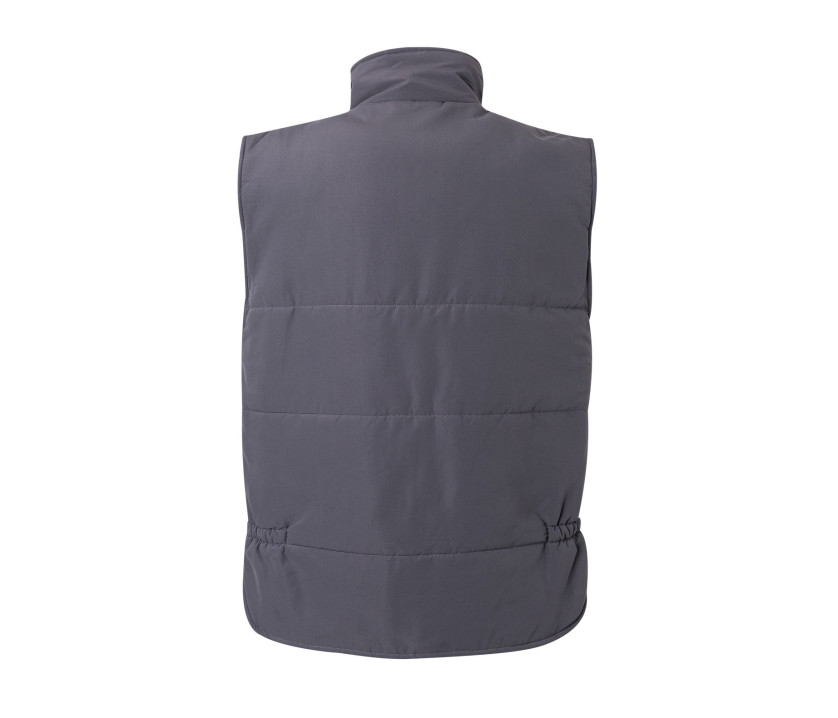 Gesteppter Bodywarmer. Klappe in der Mitte mit Druckknöpfen. Elastischer Bund. Einsatz Windjacke an den Armausschnitten. 7 Taschen: 2 Brusttaschen mit Klappe und Klettverschluss, 1 davon mit Stiftfach, 2 Vordertaschen mit Klappe und Klettverschluss und unter jeder 2 Seitentaschen, 1 Innentasche.