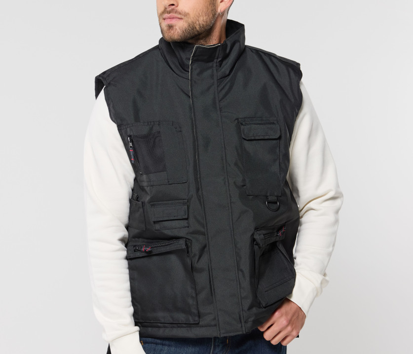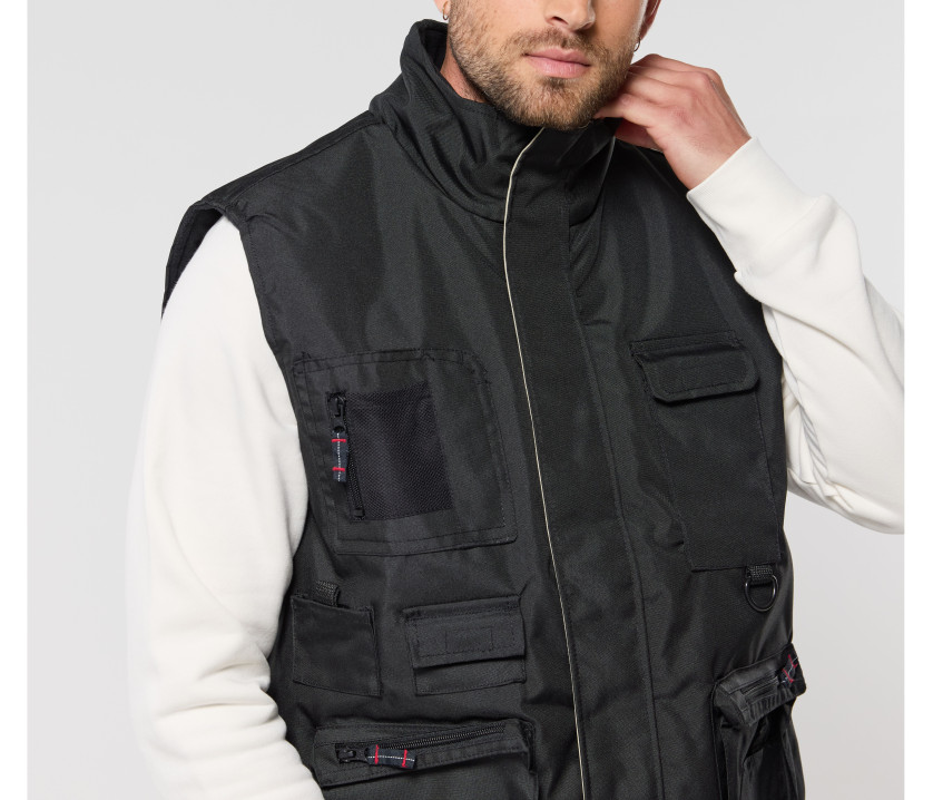 Bodywarmer winddicht, mehrere Taschen mit wasserdichter Beschichtung. Anti-Pilling. Ideal als Arbeitskleidung mit 10 Außentaschen: 2 Vordertaschen mit Reißverschluss und Faltenbalg, 3 Taschen mit Klettverschluss, 3 Brusttaschen, 1 Stifttasche und 1 Handytasche. 1 Geldbeuteltasche innen. Reißverschluss mit Klappe. Fleece-Futter. Rücken verlängert und Klettverschluss zur Anpassung der Taille. Zugriff für die Personalisierung.