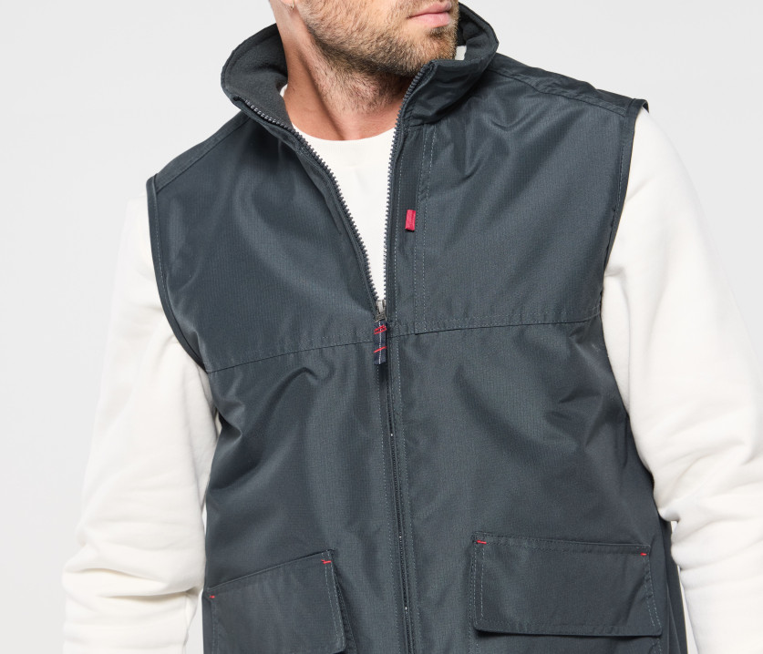 Bodywarmer wasserdicht und solide. Winddicht. 2 Taschen aufgesetzt mit Velcro®. Brusttasche mit Velcro®. Zugriff für die Personalisierung. Fleece-Futter.