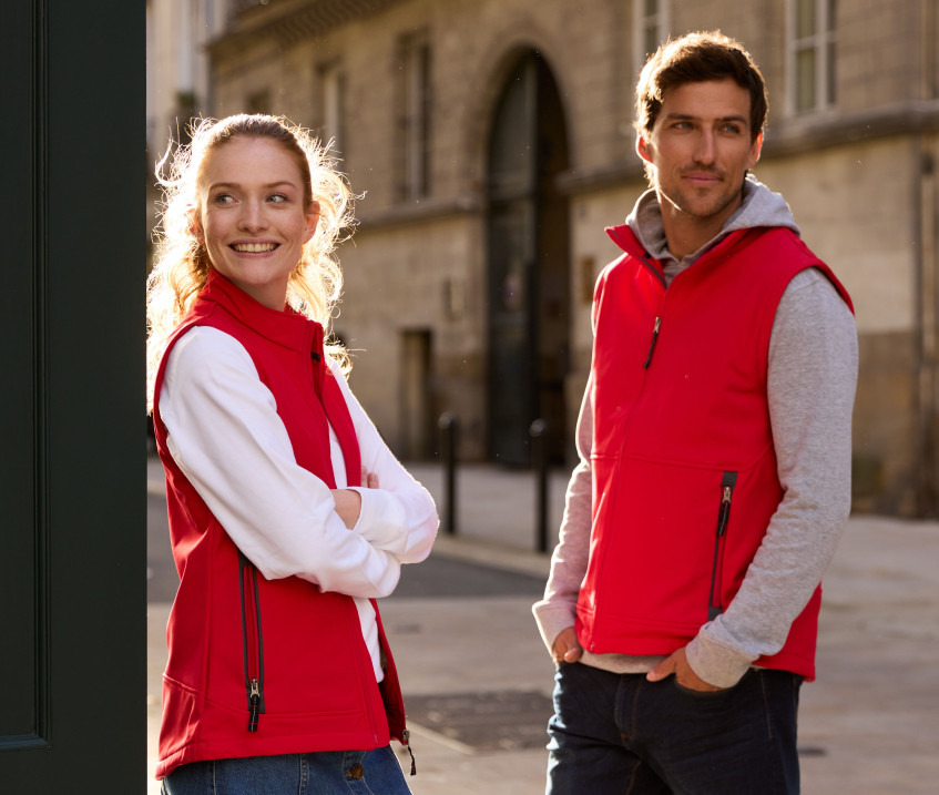 Softshell-Weste, sehr leicht. 3-schichtiger Stoff mit atmungsaktiver Membran befestigt (800g) und wasserdicht (3000-5000mm). 2 Reißverschlusstaschen. Gummiband unten mit Stoppern. Innenmaterial aus Microfleece. Anliegende Passform.