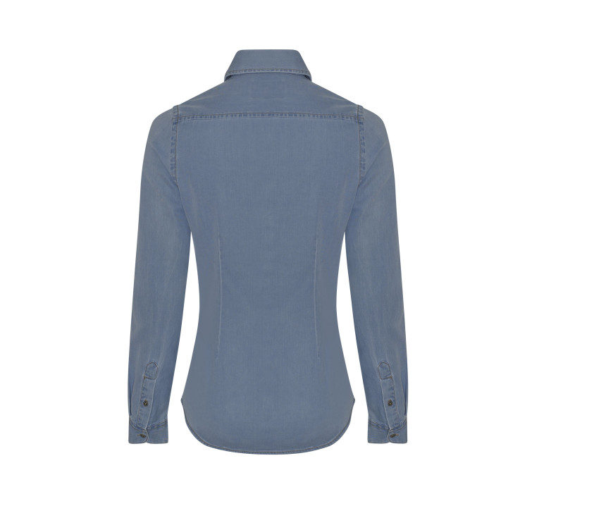 Abgerundeter Saum. Modische anliegende Passform. Kontrastierte Naht an Kragen und Knopfleiste. Kontrastierte Doppelnaht an den Seiten, Ärmeln und Ärmelbündchen. Ärmelbündchen 2 Knöpfe. Modischer schmaler Kragen. Ohne Tasche. Einsätze an den Schultern im Rücken.