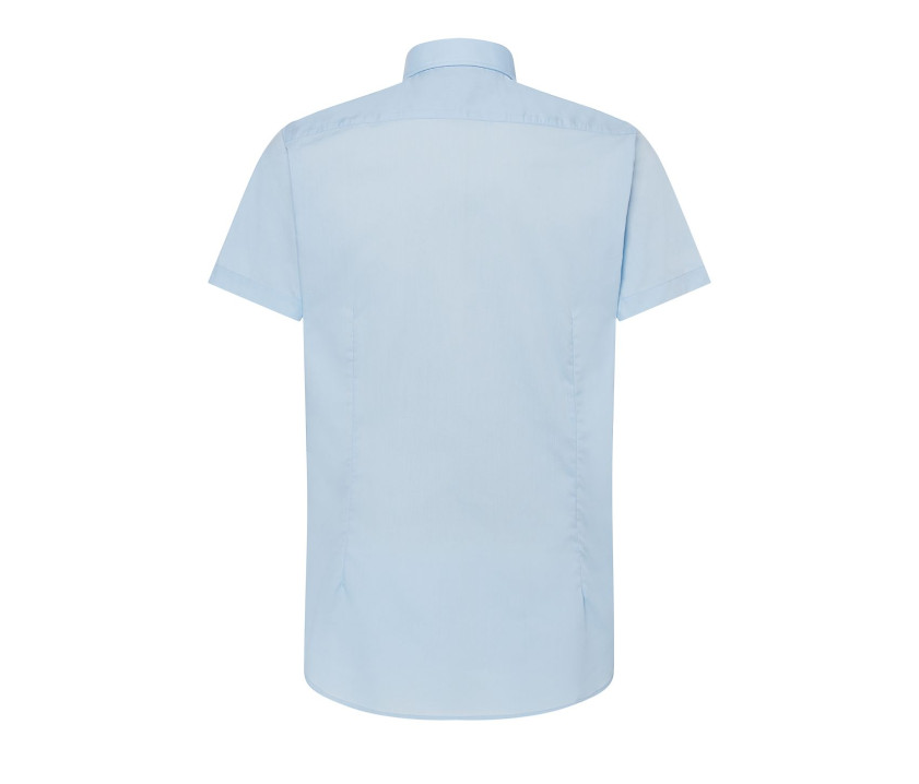 Kurzärmeliges Hemd. Geknöpfter Kragen. Tasche linke Seite. Farblich passende Knöpfe.
