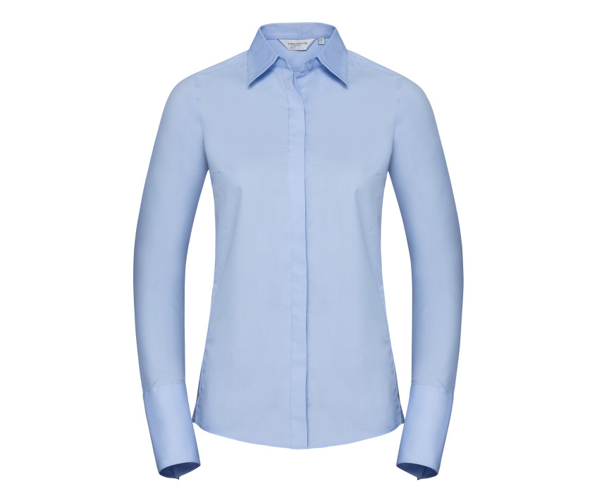 Feuchtigkeitsmanagement für mehr Frische und Komfort. Strapazierfähiges Gewebe. Tailliert. Modischer Kragen, gepflegter Abschluss. Versteckte Knopfleiste. Princesse-Paneele (ohne Seitennähte). Kurze Klappe, Kragen halb aufgeweitet. Abnäher am Rücken. Manschetten und neapolitanische Manschetten. Option Manschettenknöpfe. Ohne Tasche.