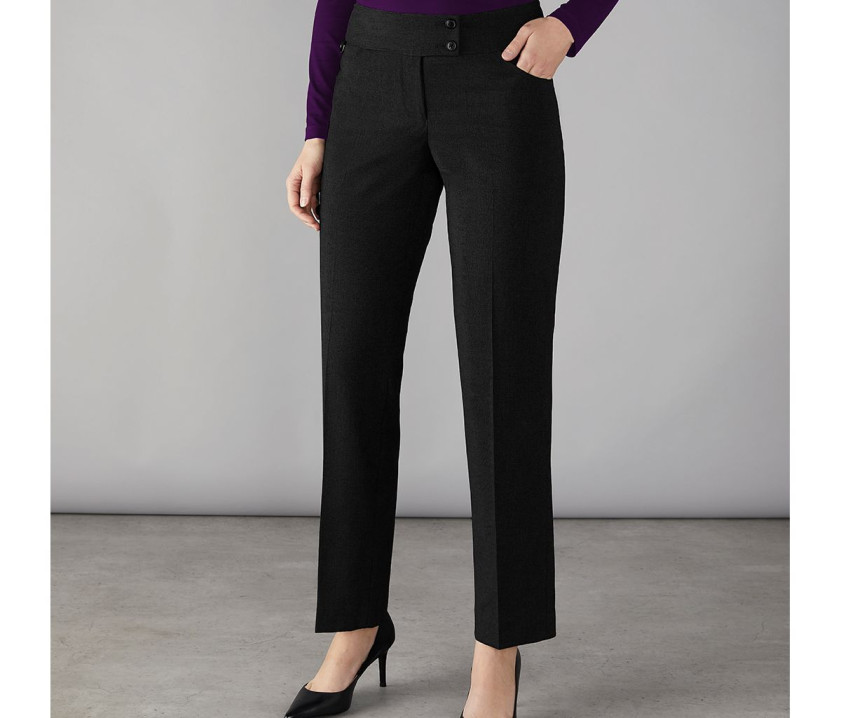 Damenhose mit Bügelfalte. Hosenschlitz mit Reißverschluss und Knöpfen. Slim Fit-Passform. Schlüsselring. 2 Taschen. Niedrige Taille. Breiter Bund. Maschinenwaschbar.
