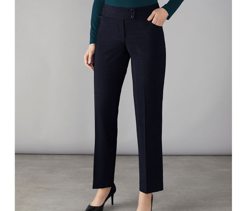 Damenhose mit Bügelfalte. Hosenschlitz mit Reißverschluss und Knöpfen. Slim Fit-Passform. Schlüsselring. 2 Taschen. Niedrige Taille. Breiter Bund. Maschinenwaschbar.