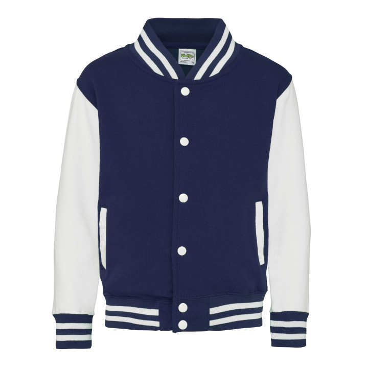 Kontrastärmel. Rippenbündchen mit Kontraststreifen an Kragen, Ärmelabschlüssen und Bund. Druckknopfverschluss. Kontrastierte Druckknöpfe. Taschen mit kontrastierten Paspeln. Innen aus gebürstetem Molton. Nackenband. Ablösbares Etikett.