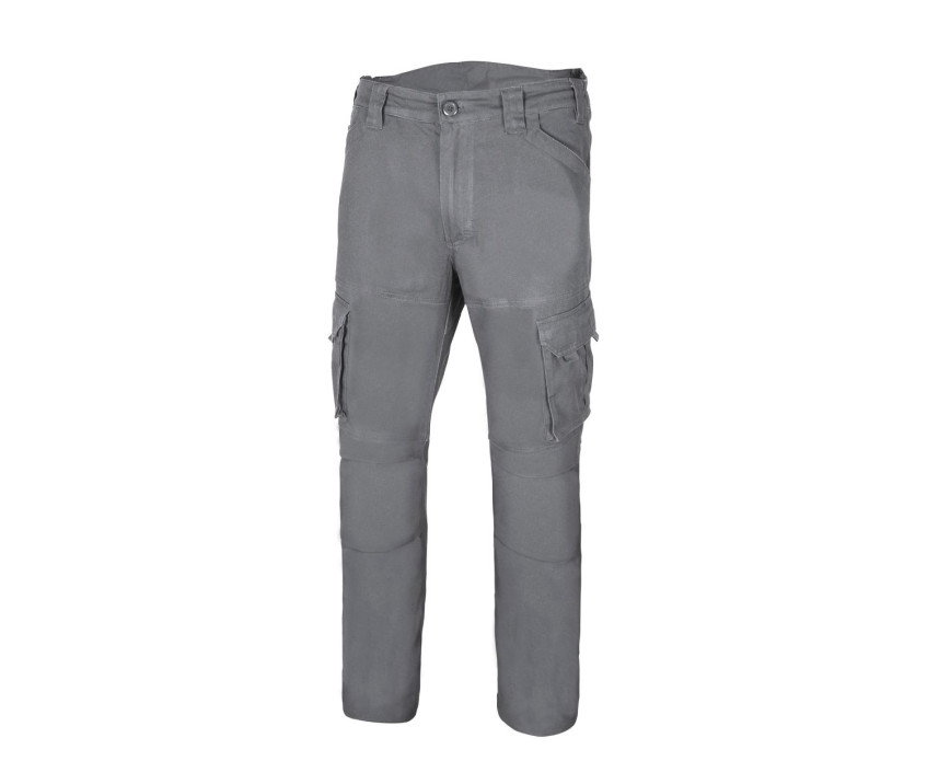 Hosenschlitz mit Knopf und Reißverschluss. Gewebe hinten verstärkt. Verstärkung an den Knien. Elastischer Bund an den Seiten. Höherer Gürtel hinten. Dreifache Sicherheitsnaht. 8 Taschen.