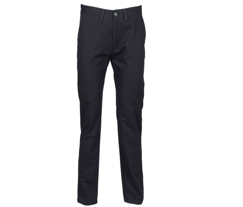 Hose ohne Abnäher vorne. Gerade Passform. 2 Gesäßtaschen mit Knöpfen. Gürtelschlaufen. Farblich passende Knöpfe.