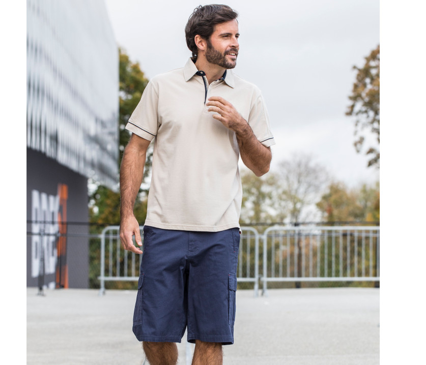 - 2 Seitentaschen mit Steppnaht. 2 Seitentaschen mit Klettverschluss. Verschluss per Schnalle am Bund.