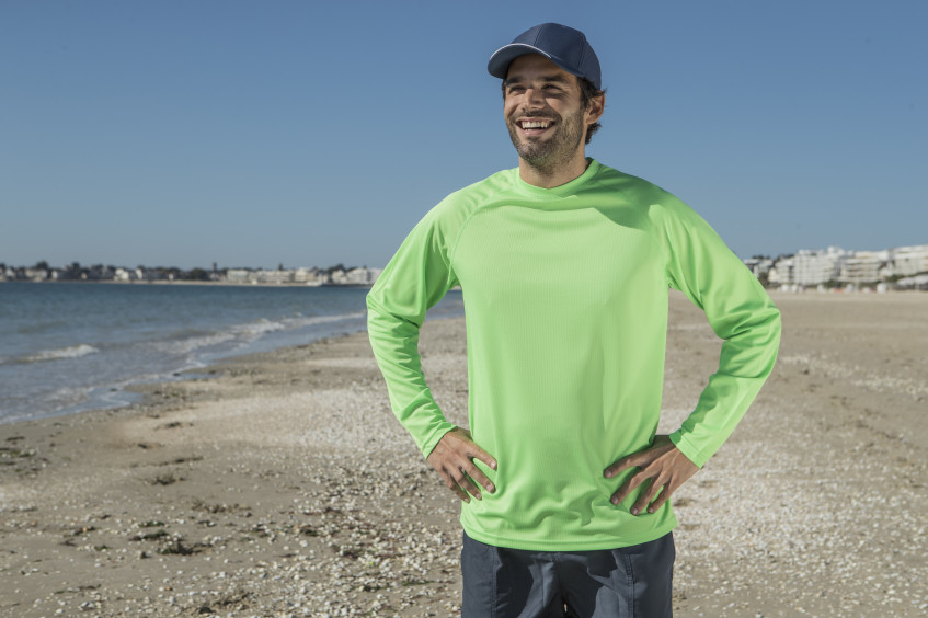 Material 100 % Polyester, gut schweißdurchlässig. Leicht und atmungsaktiv. Lange Raglanärmel.