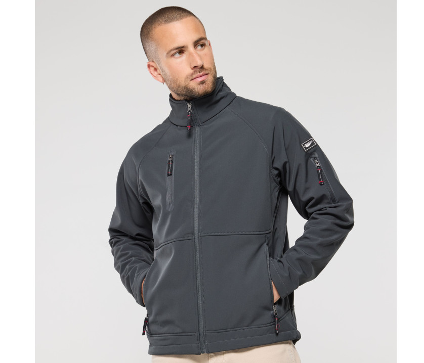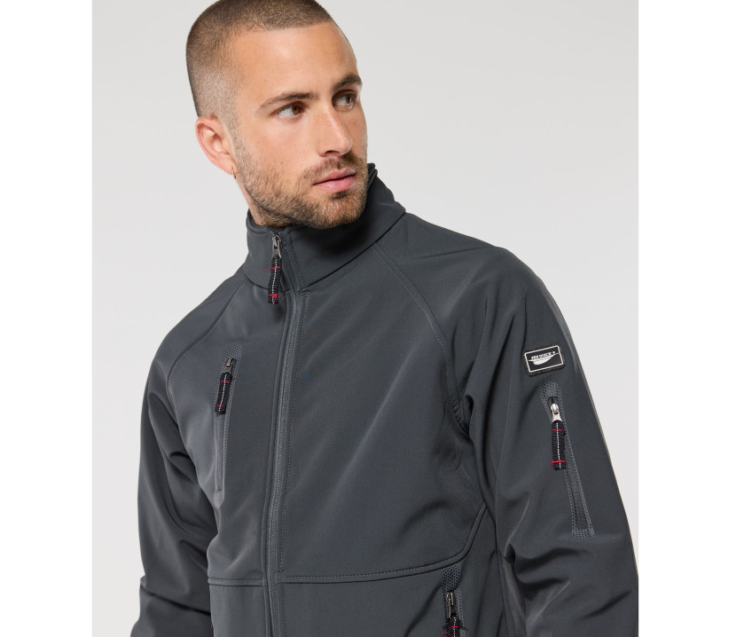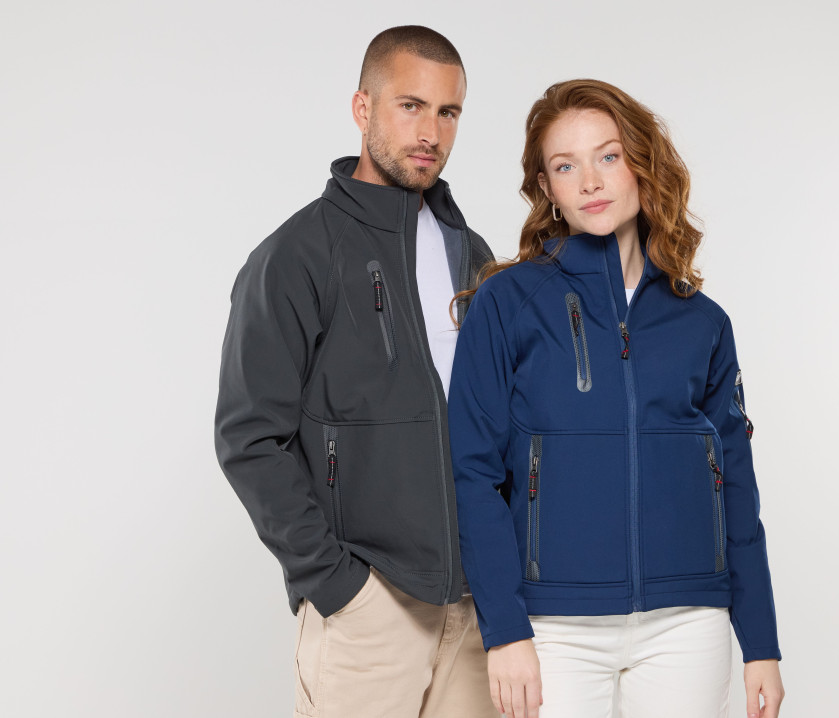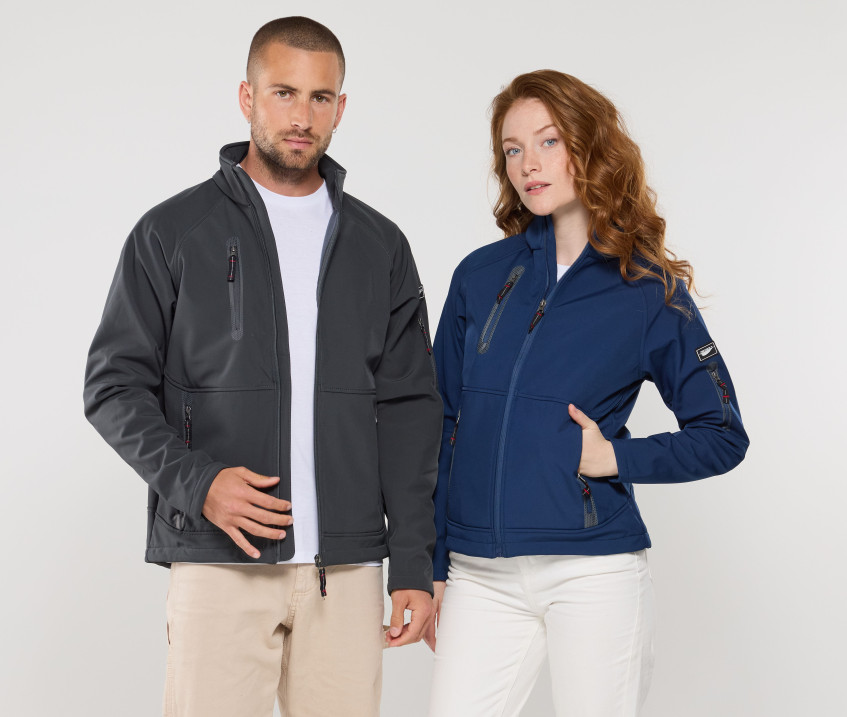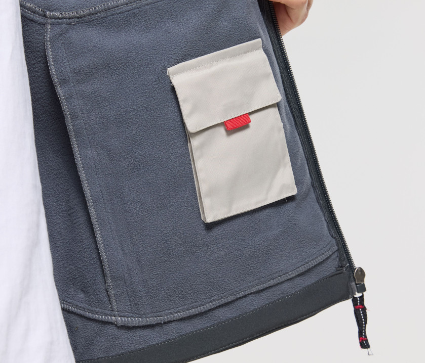 Softshell-Jacke, sehr leicht. 3-schichtiger Stoff mit atmungsaktiver Membran befestigt (800g) und wasserdicht (3000-5000mm). Innenmaterial aus Microfleece. 3 Außentaschen mit Reißverschluss. Gummiband unten mit Stopper. Anliegende Passform. 1 Reißverschlusstasche am Arm. Modell Bodywarmer PK765 Seite 187.