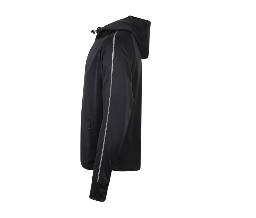 Kapuzensweatshirt mit Reflexstreifen. Raglanärmel. Körpernahe Passform. Innentasche MP3. 2 Seitentaschen mit Reißverschluss.