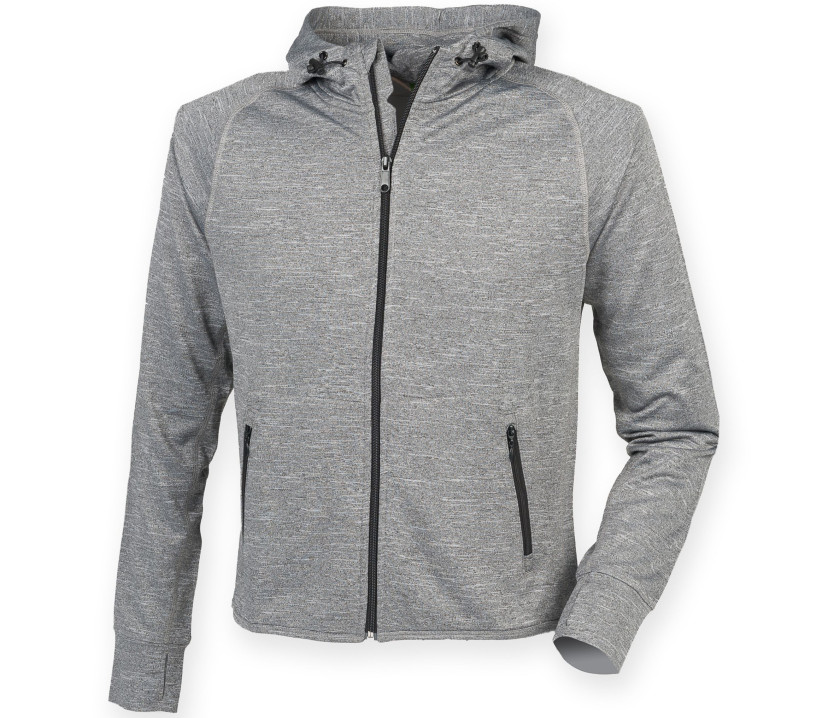 Kapuzensweatshirt mit Reflexstreifen. Raglanärmel. Körpernahe Passform. Innentasche MP3. 2 Seitentaschen mit Reißverschluss.