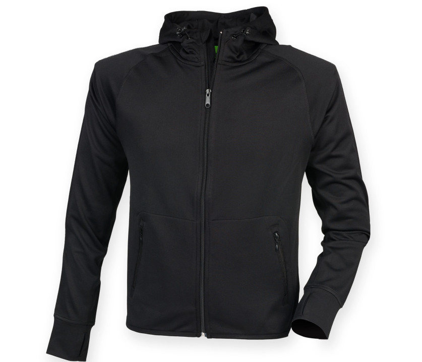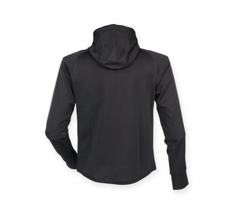Kapuzensweatshirt mit Reflexstreifen. Raglanärmel. Eng anliegende Passform.. Innentasche MP3. 2 Seitentaschen mit Reißverschluss.