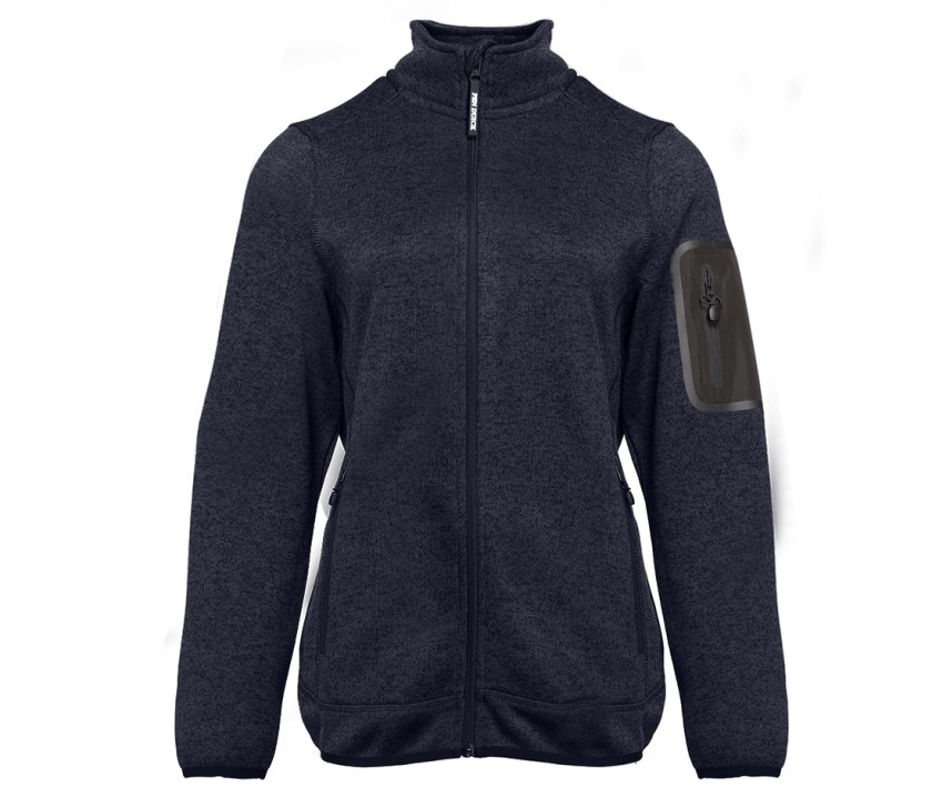 Gestrickte Fleece-Jacke für Damen 300 g/m². Reißverschlusstasche am Arm. 2 Reißverschlusstaschen.