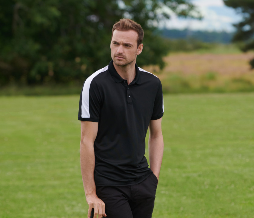 Stretch-Material mit Anti-Feuchtigkeits-Technologie. Anliegende Passform. Kontraststreifen Schultern und Ärmel. Kragen und Armausschnitte mit Rippenbündchen. Gerade Ärmel. Knopfleiste mit 3 Knöpfen, farblich abgestimmt und Kontrastnähte. Ablösbares Etikett.