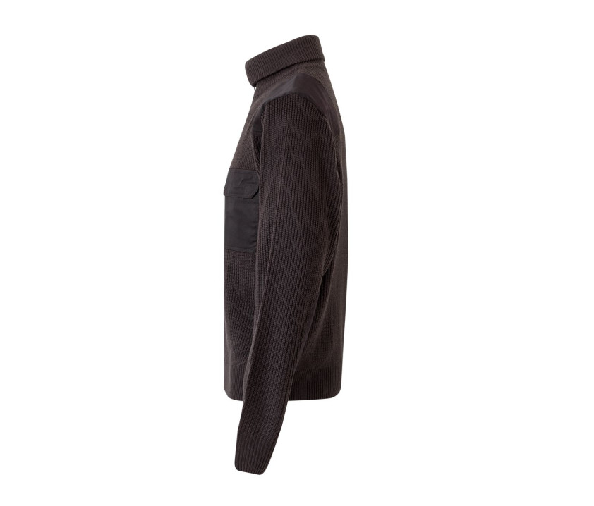 Gauge 7. Anti-Pilling. Stehkragen mit Reißverschluss. Verstärktes Gewebe an Schultern und Ellenbogen. Rippenbündchen an Kragen, Ärmelabschlüssen und Bund. Brusttasche mit Klettverschluss und Klappenöffnung für Stifte.