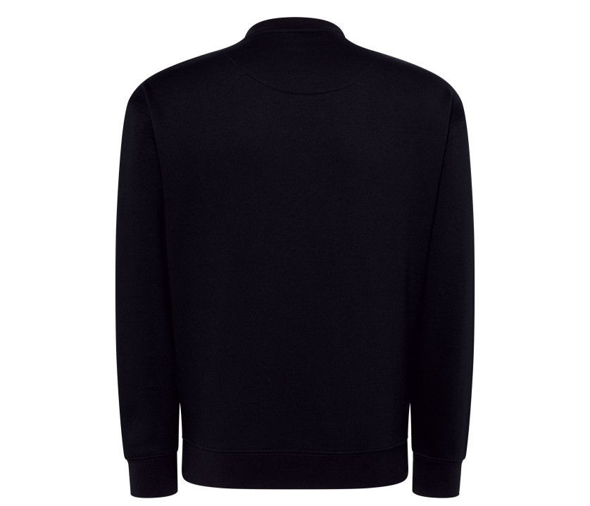 Doppelnaht Kragen, Ärmel und Bund. Rand 1x1-Strick mit Lycra an Kragen, Ärmelbündchen und Bund. Runder Halsausschnitt. Gerade Ärmel. Umstellung des Lagerbestands: Polyester/Baumwolle zu Baumwolle/recyceltem Polyester.