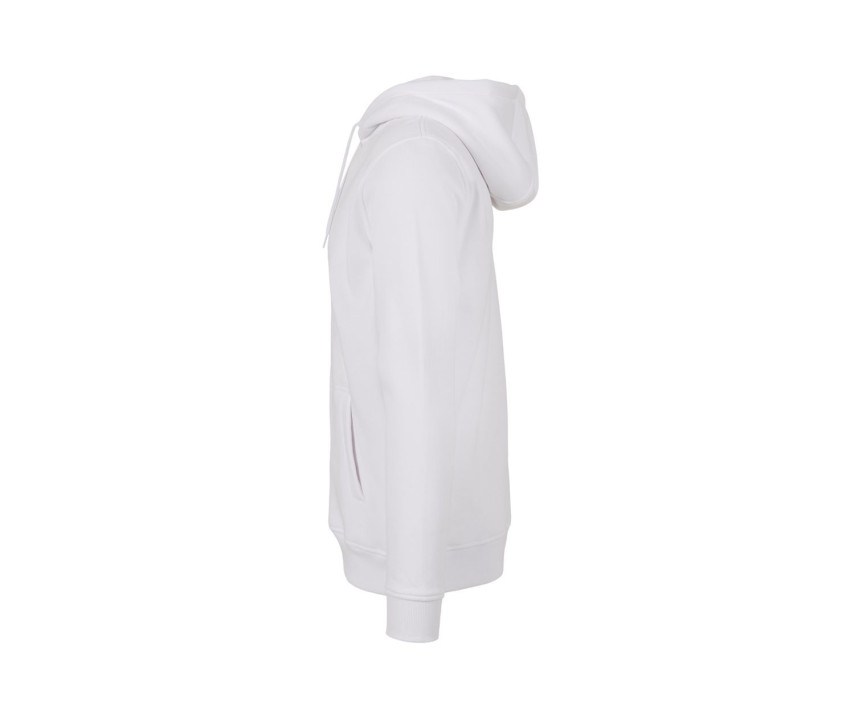 Verstellbare Kapuze. Große Kängurutasche. Rippenbündchen an Saum und Ärmeln. Innen aus angerautem Molton. Ohne Markenetikett, nur mit Größenangabe.