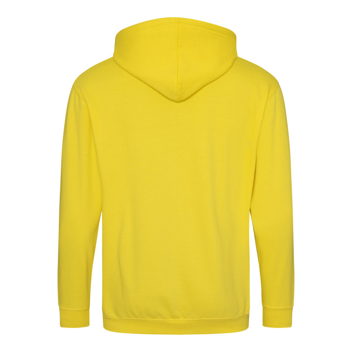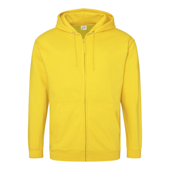 Durchgehender Reißverschluss. Innen gebürstet. Unsichtbarer Reißverschluss. Gefütterte Kapuze mit Zugbändern in passender Farbe. 2 Fronttaschen. Rippenbündchen an Ärmel und Saum. Ablösbares Etikett.