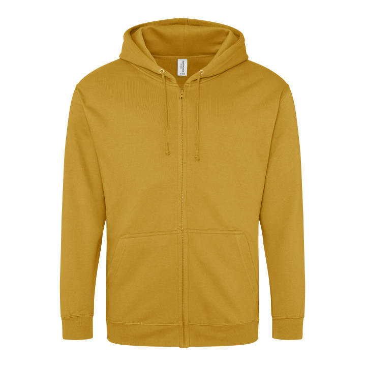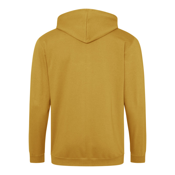 Durchgehender Reißverschluss. Innen gebürstet. Unsichtbarer Reißverschluss. Gefütterte Kapuze mit Zugbändern in passender Farbe. 2 Fronttaschen. Rippenbündchen an Ärmel und Saum. Ablösbares Etikett.