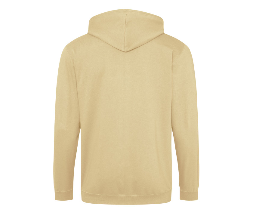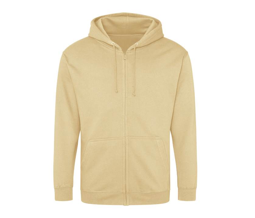 Durchgehender Reißverschluss. Innen gebürstet. Unsichtbarer Reißverschluss. Gefütterte Kapuze mit Zugbändern in passender Farbe. 2 Fronttaschen. Rippenbündchen an Ärmel und Saum. Ablösbares Etikett.