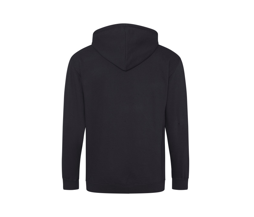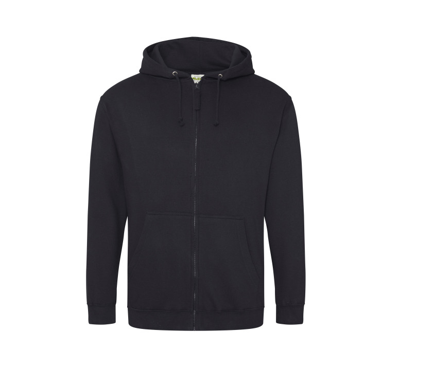 Durchgehender Reißverschluss. Innen gebürstet. Unsichtbarer Reißverschluss. Gefütterte Kapuze mit Zugbändern in passender Farbe. 2 Fronttaschen. Rippenbündchen an Ärmel und Saum. Ablösbares Etikett.