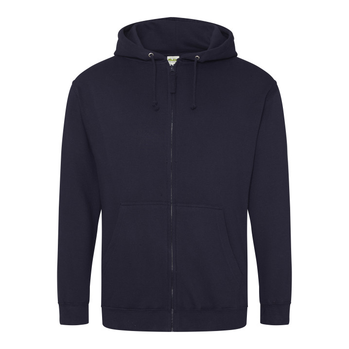 Durchgehender Reißverschluss. Innen gebürstet. Unsichtbarer Reißverschluss. Gefütterte Kapuze mit Zugbändern in passender Farbe. 2 Fronttaschen. Rippenbündchen an Ärmel und Saum. Ablösbares Etikett.
