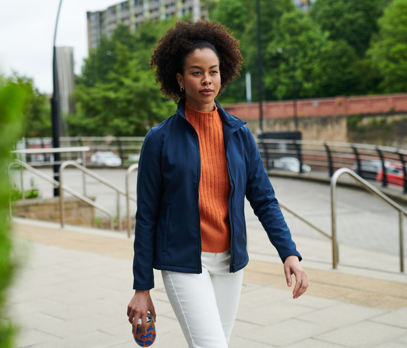 Damen Softshelljacke - Innenliegende Windleiste. 2 Fronttaschen mit Reißverschluss. Per elastischem Zugband Verstellbare Größe.
