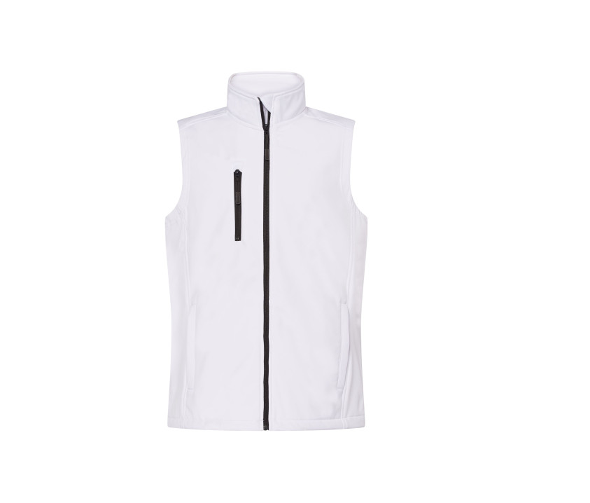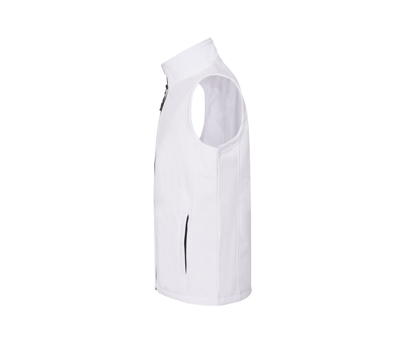 3-lagiger Softshell-Bodywarmer. Durchgehender Reißverschluss. 3 Reißverschlusstaschen. Fleece-Futter mit Stoppern. Wasserdicht 8000 mm, atmungsaktiv 3000 g.