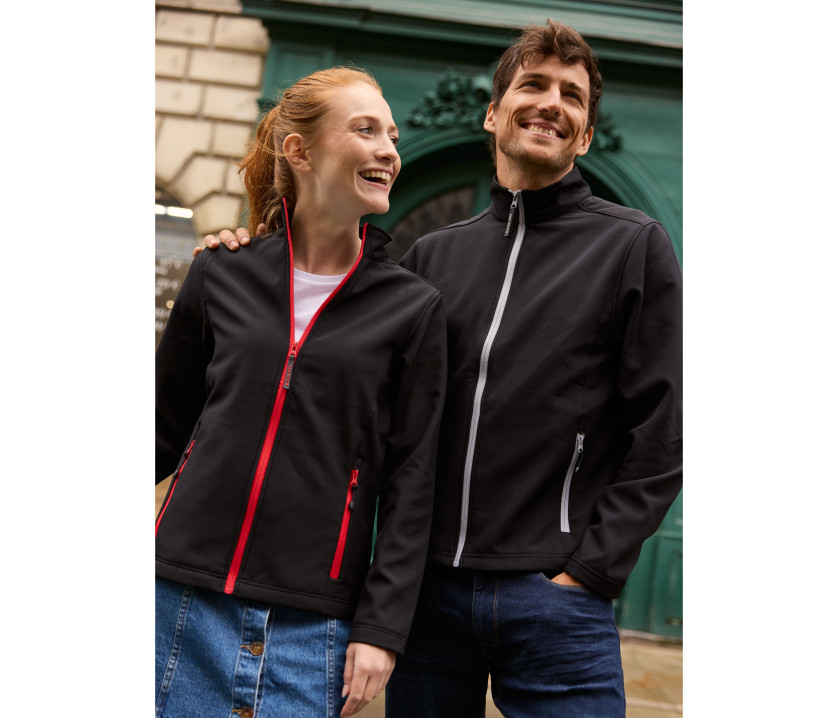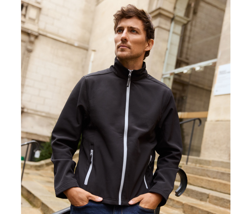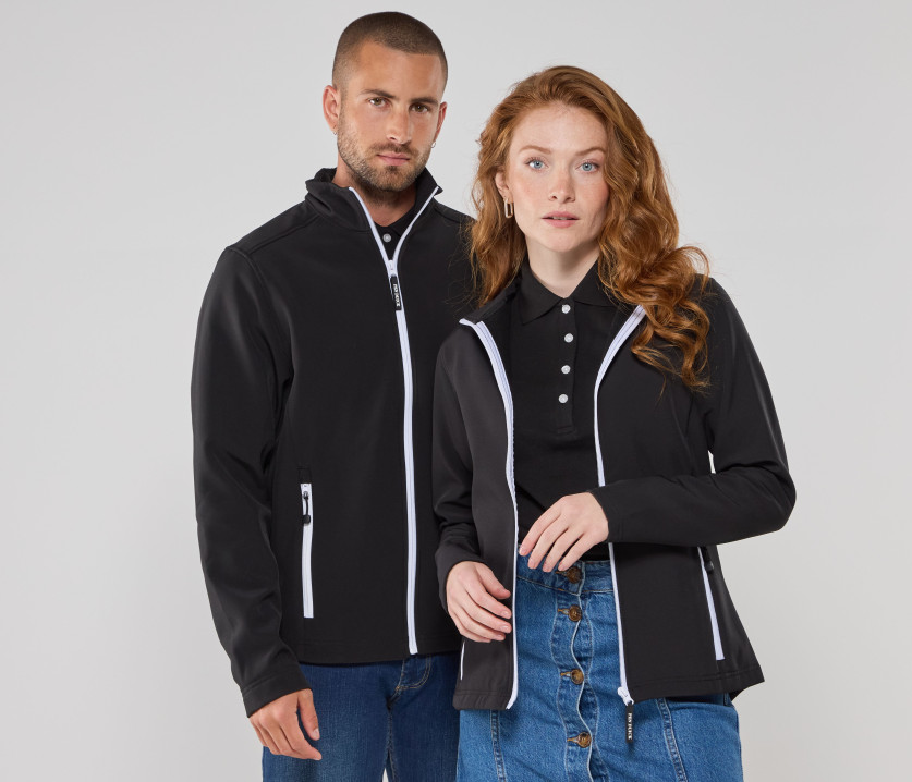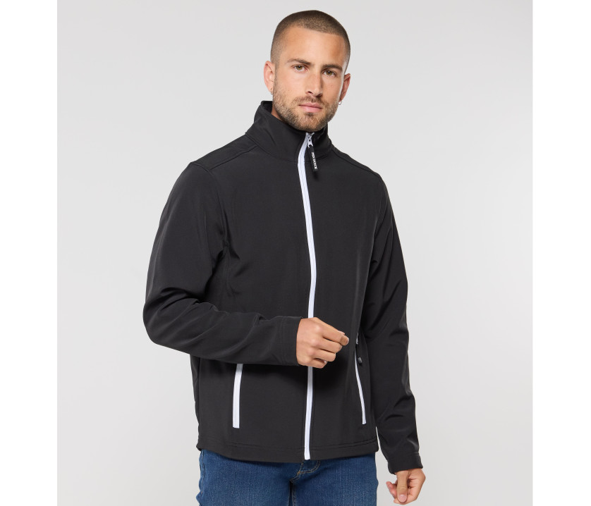 Softshell Herren. Fleece-Futter. Umgekehrter Reißverschluss. Eingesetzte Ärmel. 2 Innentaschen aus Netzgewebe. 2 Taschen mit Reißverschluss an den Seiten. Kinnschutz. Bodywarmer Ref. PK330 Seite 185.