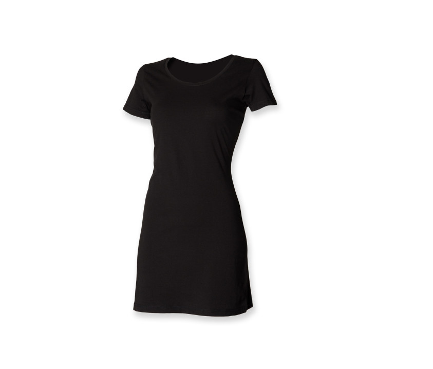 Kleidförmiges T-Shirt. Rundhalsausschnitt. Kurze hochgekrempelte Ärmel.