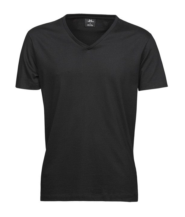 Anliegende Passform. V-Ausschnitt. Mit Lycra® gefütterter Halsausschnitt. Nackenband. Doppelnähte. Vorgewaschene Baumwolle. Waschbar bei 60 °C.