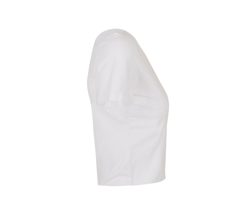 Kurzes T-Shirt (über dem Nabel). Ohne Markenetikett, nur mit Größenangabe. Seitliche Nähte.